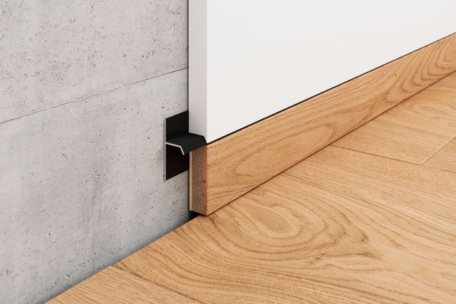 Beim Einsatz des Profils als Grundprofil für wandbündige Sockelleisten kann die Leiste abschließend in die Schattenfuge eingeklebt oder gesteckt werden.